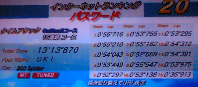 ふらりとレジャランに立ち寄って新T/ATを4クレほど。 ホームではどういうわけかこの4クレで集中が切れることが多いので、 繋ぎの精度には期待していなかったものの・・・ 前のタイムよりコンマ3ほど上回り、遂に13分26秒台~ インターネットランキング その間の2日間とも行きたかったものの、金欠だったため自粛して自転車の手入れをがんばる。 (つってもママチャリですが) そして今日、財布にある限りの小銭を突っ込んで新T/AT開始 ジャングルに更新の光が見えた気がしたけど上手くいかず。 1セクの抜け速が270km/h切ってたら追い上げる事はできても、更新は無理だと思う。 3セクは切り返しで多少アクセル抜いても良いから、300km/hフルスピードで行きたいんだけど・・・ 一方のミルキーは相変わらず3セクで黄テスタのケツをこする日々 インベタの感覚忘れちゃったなあ 明日は何をやろう? PR 2008.03.23 Sun 19:22:22 気分は大気圏に突入した隕石インターネットランキング 5位 コメント元ネタはオトメディウスのエモン・5 店に着いて始めた時点ではメイン台がフィードバック不良でまともに走れず 店員を呼ぶとメンテできる人が居ないからと調整中札を貼られたので、 AT台で2回やるも直しに来る気配なし。 週1回しかこれないのにメイン台でアタックできないだなんて、ここに来た意味が無い。 仕方ないので、カウンターで楽しく雑談中の店員さん達に KYオーラ出しながらアウトランに連れて行って直してもらう。 えらく時間が掛かったけど復活。残り2時間。 ステアはニュータウン右台とあまり変わらないけれど、不思議な集中できる魔力のおかげで森ゴーストを次々塗り替え。 でも今日は理論値工場じゃなくて繋ぎたいんですけど。 以前の感覚で15連を2回1セットで休憩をしつつ気付けばもう残り20分と半端 明日筋肉痛でベッドから出られなくなっても良い覚悟でガッツンガッツンと維持しまくり おかげで13分14秒587出た! ・・・・・・こんなので満足できるか ここで諦めたらタイムアタッカの名折れ、明日病院の集中治療室から出られなくなっても良い覚悟を決めてプレー前に精神統一 ここでまさかの森52秒297と微妙な更新でコンマ2台突入 好調を落とすどころか上げる勢いでゴーストに密着 ああ、なぜか後ろでWCCFやってる少年がこっちを真剣に見てる 頼むからもっと視線を送って集中力をくださいなんちて。 5Cが初めて繋がってる時に牙をむきコンマ3落ちと残念な事になったものの、 5Dも微更新で初の53秒9台 続く岬も妥協など知らない走りで壁をなめ回してベストとほぼ変わらぬ35秒913 トータルは・・・・13分13秒台キタコレ! 出発前に携帯に落とし込んでおいたMIDさんの森動画が大変役に立ちました。 (出遅れましたが新T/MT Bの金メダルおめでとうございます!) そして・・・当初の目標だったSAT.さんを追い越しちゃった!順位下げてごめんなしあ>< また、そのうちアタック再開してくれたら良いなと願ってます。願うだけなら自由ですよね! さて、次なるターゲットは・・・(・∀・) 2008.03.17 Mon 05:42:09 モチベ急落中2008.03.15 Sat 18:31:01 成東かすかな期待で成東アーバンスクエアに行ってもらったら