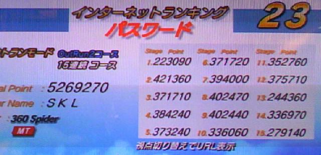 初詣と言えばお賽銭とお願いごと!(筺体にお賽銭と更新願い) そのあとはおみくじで1年の運勢に一喜一憂!(記録更新=大吉と解釈) 神社でやること全部ゲーセンで済ませてしてきましたが何か? 今年も至って平常運転です。 アウトランモード旧15連 5269270点 インターネットランキング(6位→4位) 新年1発目の更新は原点回帰を暗示しているのか、15連の更新。 自身のアウトランモード申請記録としては初となる、全赤車満額+分岐入口ラインボーナス全獲得(5C除く)となりました。 3コース目の点が低いのは恐らく分岐出口のラインボーナス取り逃しか、道中の大型車を2台とも減額したかと・・・(覚えてない) やっているだけでも楽しいのが旧コース。ただ、アウトランモードのノーマル車挙動に関してはド素人も良い所の私ですが、そんな私でも回数を重ねるごとに楽しさが見い出せてくるのがこのゲームの良い所。 上手い人のプレーが間近で見られる&動画で見れる事もあって、触発されてはたまにプレーしていました。 このカテゴリーの難所と言えば、「森の入口ラインボーナスがギリギリ過ぎて取れない!」「最終ステージの3セク峠道のイニDバトルで赤車に進路塞がされる!」「5Cの入口ラインどう取るの?!無理ゲー?」等など上げたらきりもありませんが、これをアクセル全開で攻略するのがこのカテゴリーの醍醐味かと思います。 あと3万点以上上乗せ出来れば表彰台だった事を考えると、スリップストリームの繋ぎ、及び敵車無接触ボーナス、コース外侵入による減点を抑えれば「言う分には」表彰台どころか530万点台も見えてくるんですが・・・ この回、森のラインボーナスはドリフト直前に敵車から僅かながら加速させてもらって取れたんですよねw なんとなく2セク3セクを通過するラインは掴めた気もしますが・・・タイムアタックに一息入れたい時にまたぼちぼちやります。 PR TrackbacksTRACKBACK URL : CommentsComment Form |