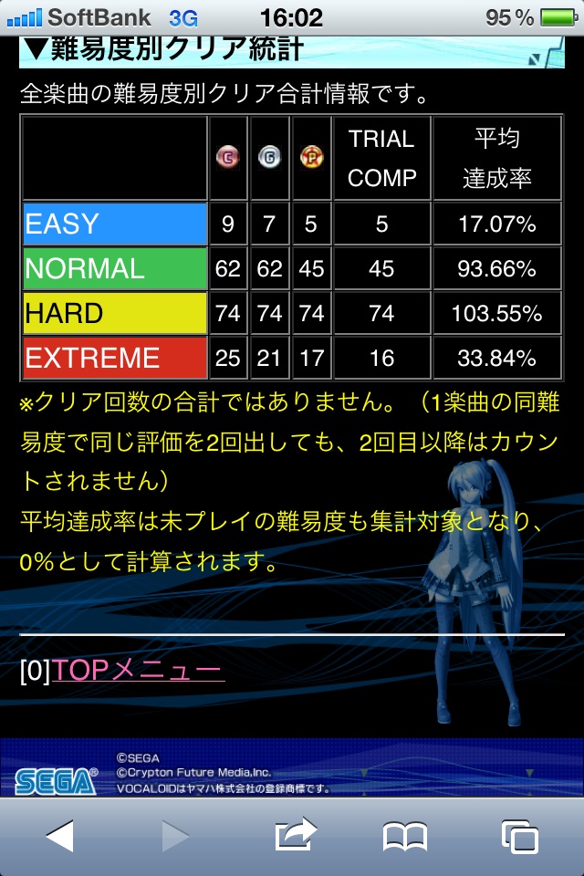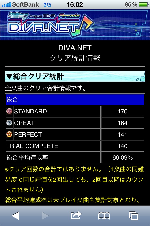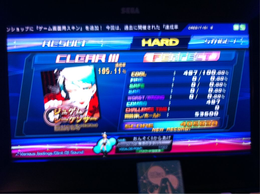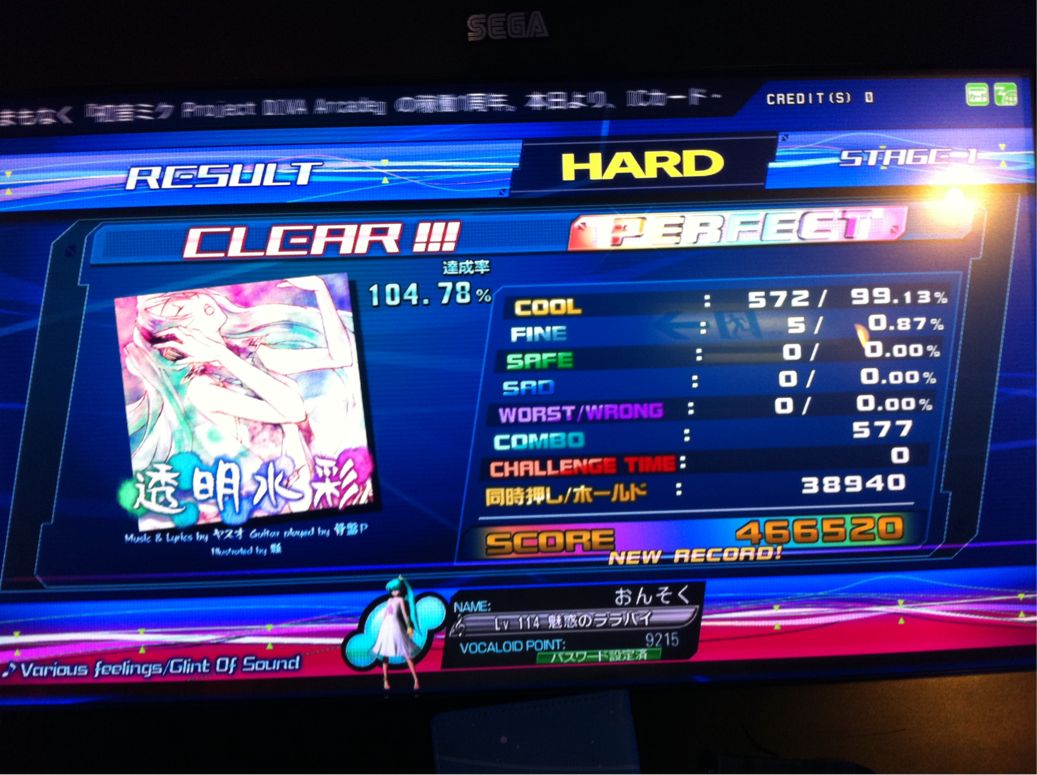いろは唄 H 296位 初ランクイン不明 透明水彩 H 125位 初ランクイン40位 補足: COOL 573 FINE 4 . . . 同時押し/ホールド 38520点 SCORE 466310点 ランクイン期間が長い順 透明水彩>いろは唄>ジュゲム 透明水彩Hは初めてプレーした時に一目惚れしたかのように今もスコアアタック中、 ジュゲムHは周りの様子とランキングの異常な詰まり具合をみて楽しそうだったので。 どの楽曲もそうですが、まずはFINEを減らすことで基本点をMAXまで出したいですね。 余裕があればホールドも粘る、という風に。 ・・・現実は、ホールドの早入り遅入りで頑張り過ぎてFINE出ることが大半なんですがw 2011.06.13 Mon 21:06:28 No.001 ブログの方向性を変える!というほどでもありませんが 本日より、アーケードで稼働中の「初音ミク ProjectDIVA Arcade」のプレイ日記も登録できるようにブログの一部を整備しました。