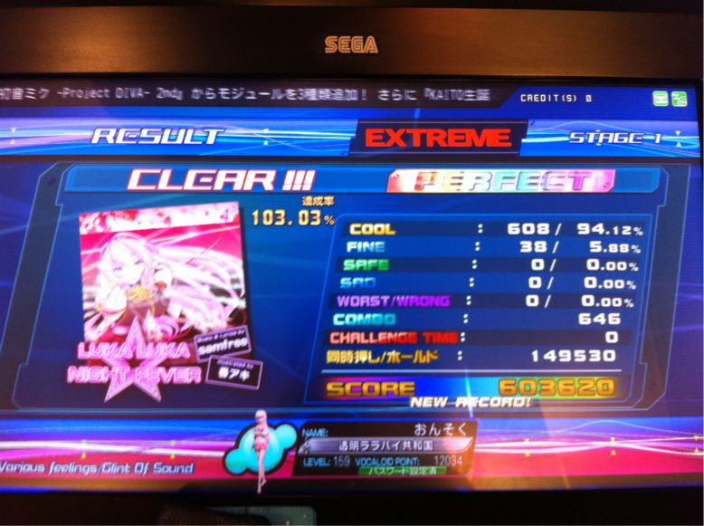 という具合に、凄まじい勢いで増え続ける楽曲もHARDだけは全曲パーフェクト続行中。 いつのまにやら達成率ランキングなるものが実装されましたがランクインする気無いよ!その前に近くに筐体よこせ! 一方こちらはルカルカ☆ナイトフィーバーEX。 去年の12月は当初配信予定がなかったものの、既にこれだけ仕込み済みだったそうでクリスマスプレゼントを兼ねての単曲配信。 これが中々楽しくて、程よく難しいのですがめげずにひたすらパーフェクト目指して二ヶ月、やっとこさフルコンボ達成。スコアアタックも良いけど、やはり音ゲーはフルコンボするまでが1番楽しいなと。 今月も既に木曜にはPSP版最強最悪と名高い「初音ミクの激唱」とその他が配信されますが...高額運賃払ってまでゲーセン行っても大混み間違いなしなので、しばらく全パーフェクトはスルー予定(´Д` ) PR CommentsComment Form |